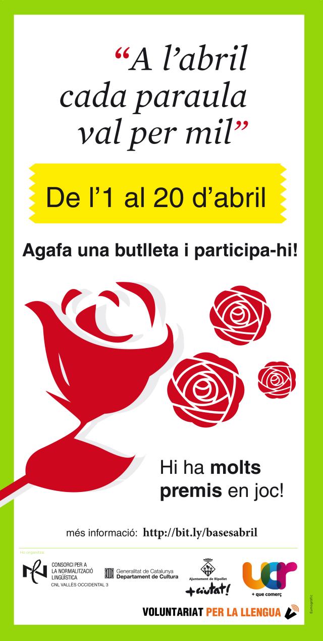Aquest mes d'abril, i amb motiu de la diada de Sant Jordi, es durà a terme la campanya 'A l'abril cada paraula val per mil', que dóna el tret de sortida l'1 d'abril fins al dia 20 d'abril. Les botigues de Ripollet que s'hi adhereixin exhibiran un cartell al seu aparador amb una paraula catalana relacionada amb el món del comerç. Els participants del joc, que poden tenir qualsevol edat, comptaran amb unes butlletes que contenen unes determinades paraules. L'objectiu del joc és descobrir els establiments on es troben les paraules de la seva butlleta. Aquestes butlletes es podran trobar als comerços adherits, al Centre Cultural, a la Biblioteca o al web http://bit.ly/basesabril. A la butlleta caldrà posar-hi la llengua d'origen del mot i el segell de l'establiment.