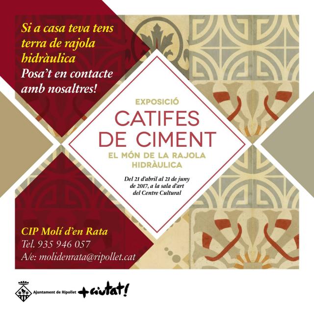 El pròxim 21 d'abril el CIP acollirà la inauguració de l'exposició Catifes de ciment. El món de la rajola hidràulica, produïda per la Diputació de Barcelona. Una mostra que porta tres anys itinerant per sales i museus d'arreu de Catalunya. Amb motiu d'aquesta exposició i per tal de complementar-la, el CIP ha fet una crida per tal que els ciutadans que tinguin a casa seva rajoles hidràuliques es posin en contacte amb el departament de Patrimoni.