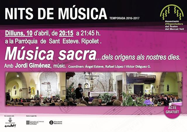 Jordi Giménez, músic i director de l'Escola de Música de Ripollet, oferirà una sessió especial de les Nits de Música dedicada a la música sacra, des dels orígens fins a l'actualitat. La sessió tindrà lloc dilluns, 10 d'abril, a l'església de Sant Esteve, de les 20.15 a les 21.45 hores, i l'entrada serà gratuïta.