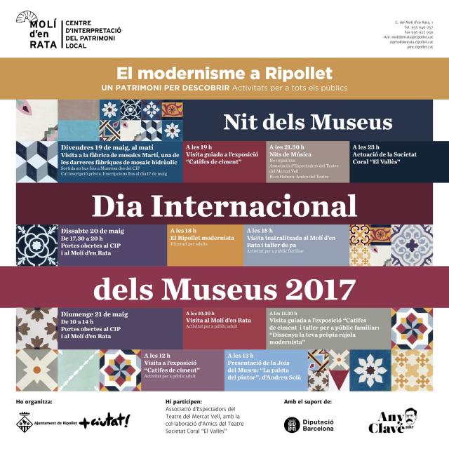Aquest cap de setmana arriba una nova edició del Dia Internacional dels Museus. Ripollet s'hi adhereix un any més, amb tot un programa d'activitats que començaran divendres, 19 de maig. Enguany, la temàtica central d'aquesta celebració a la vila serà el modernisme a Ripollet, i la petjada que encara perviu en moltes de les seves construccions. Per aquesta raó, en el programa d'activitats d'aquest 2017 s'ha incorporat un itinerari pel poble per mostrar els senyals del modernisme en alguns edificis. En el recorregut El Ripollet modernista es podran veure façanes i edificis emblemàtics: una casa a la Pujada del General Prim, que conserva unes columnes amb rajoletes modernistes; el campanar de l'església; Cal Magí, la casa al davant del Teatre Auditori (pl. de l'11 de setembre) que té una façana plena d'elements modernistes; o Cal Teixell (actual Casal de Joves, que allotja les regidories de Joventut, Educació i Comunicació-Ripollet Ràdio) que encara conserva unes poques rajoles de l'època modernista a les escales del darrere, entre altres.