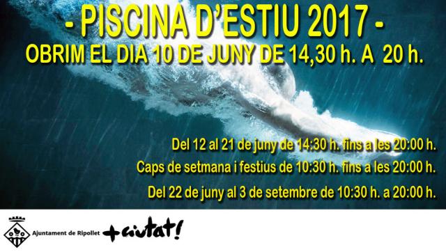 Coincidint amb la festa de cloenda de l'esport extraescolar, el poliesportiu inaugura aquest dissabte la temporada de la piscina descoberta. La piscina s'estrenarà dissabte, 10 de juny, de 14.30 a 20 hores. A partir de dilluns, dia 12 de juny, fins al 21 de juny, el seu horari serà aquest mateix, de 14.30 a 20 h. Excepte els caps de setmana i festius, quan la piscina descoberta obrirà de 10.30 a 20 h de manera ininterrompuda. La resta de l'estiu, del 22 de juny fins al 3 de setembre, l'horari de la piscina serà de 10.30 a 20 h.
