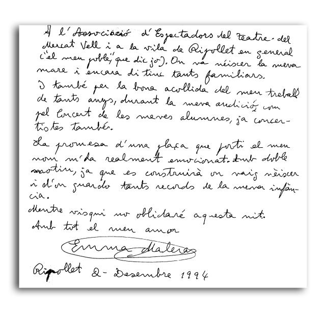 L'Associació d'Espectadors de Teatre del Mercat Vell també ha volgut recordar la figura de Maleras, amb les imatges de l'homenatge que l'entitat va fer a la ballarina ripolletenca al desembre de 1994.