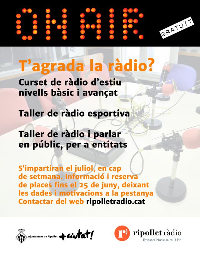 Ripollet Ràdio torna a organitzar, per sisè any consecutiu, els tallers de ràdio d'estiu. En aquests cursets, de caràcter gratuït, es donen nocions sobre el funcionament del mitjà radiofònic, locució, producció de programes de ràdio i específiques sobre informació esportiva. Consistirà en un total de quatre sessions teòric-pràctiques, que s'ha previst fer els dissabtes de juliol al matí. Segons la demanda es crearan grups de nivell inicial, avançat i d'entitats. Com és habitual, comptaran amb la participació de col·laboradors i entitats de la ràdio que explicaran la seva experiència.