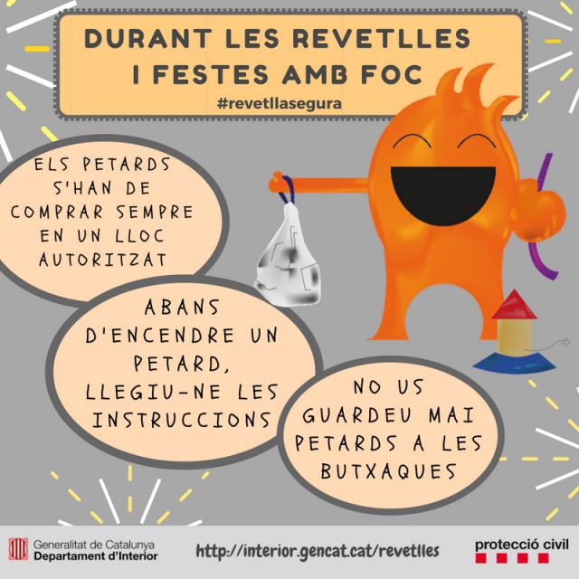 A la revetlla de Sant Joan se sumen moltes tradicions com ara les fogueres, els petards, la coca i el cava, els quals són elements indispensables. Des del departament d'Interior de la Generalitat, però, es demana precaució i una bona manipulació tant dels focs d'artifici com dels aliments per poder gaudir de la revetlla sense cap incident. Com cada any, ha publicat alguns consells de seguretat per poder gaudir d'una revetlla segura.