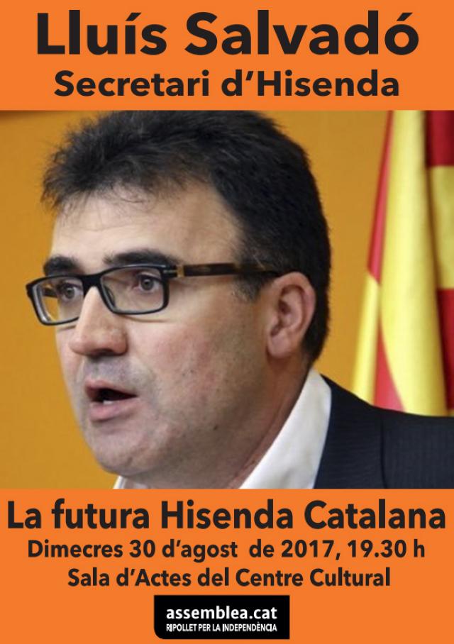 El secretari d'Hisenda de la Generalitat de Catalunya, Lluís Salvadó, oferirà aquest dimecres, 30 d'agost, al vespre la xerrada 'La futura Hisenda catalana'. L'acte tindrà lloc a la sala d'actes del Centre Cultural, a partir de les 19.30 hores. Aquesta xerrada està organitzada per Ripollet per la Independència, l'organització local de l'Assemblea Nacional Catalana (ANC).