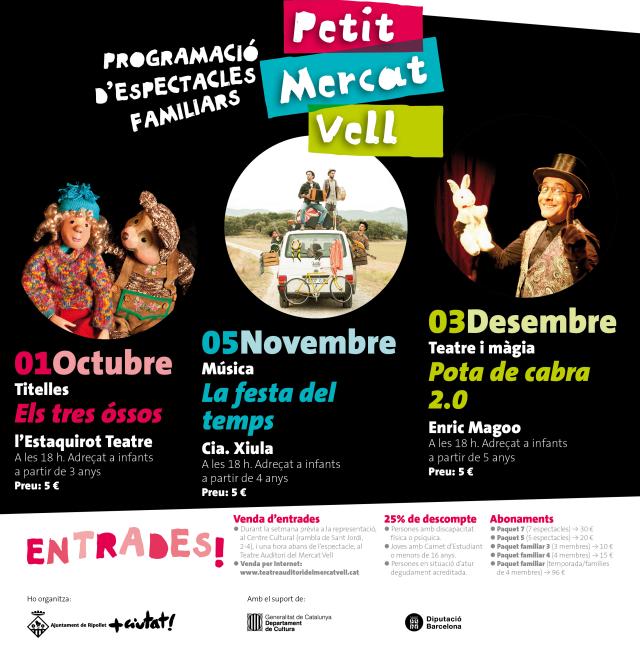El primer dels espectacles familiars són els titelles de l'Estaquirot Teatre amb l'obra "Els tres óssos". Adreçat a infants a partir de 3 anys, l'espectacle tindrà lloc el pròxim 1 d'octubre a les 18 h al Teatre Auditori del Mercat Vell. Les entrades ja es poden comprar al web del teatre www.teatreauditoridelmercatvell.cat.