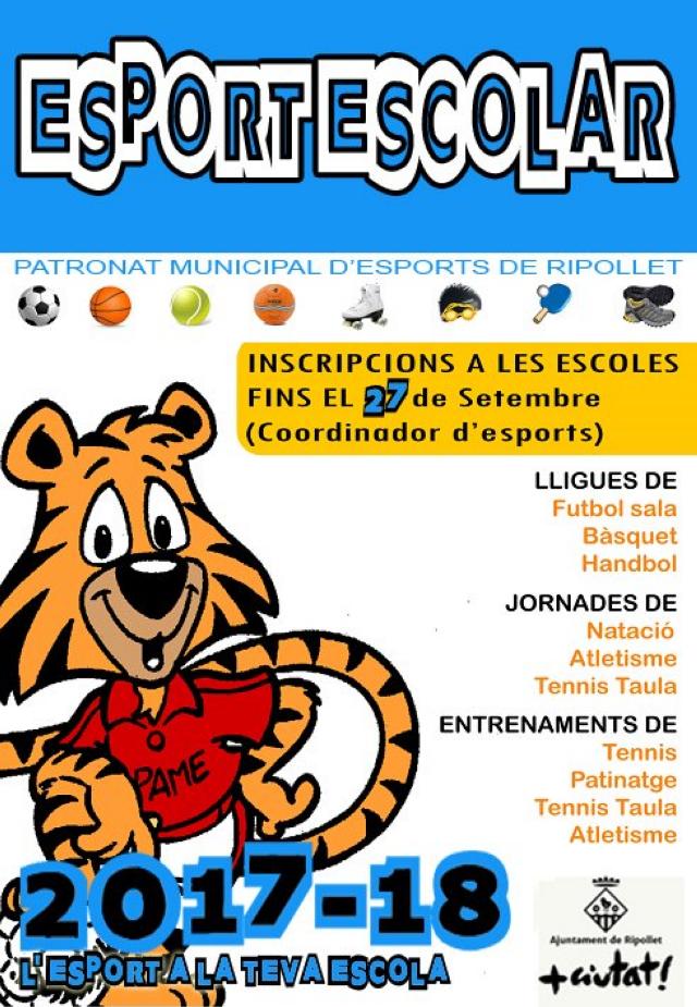 Fins al 27 de setembre és oberta la inscripció del programa d'Esport Escolar a les escoles i instituts de Ripollet. En el cas de la primària, s'ofereixen activitats de futbol sala, bàsquet, handbol, natació, atletisme, tennis taula, tennis i patinatge.