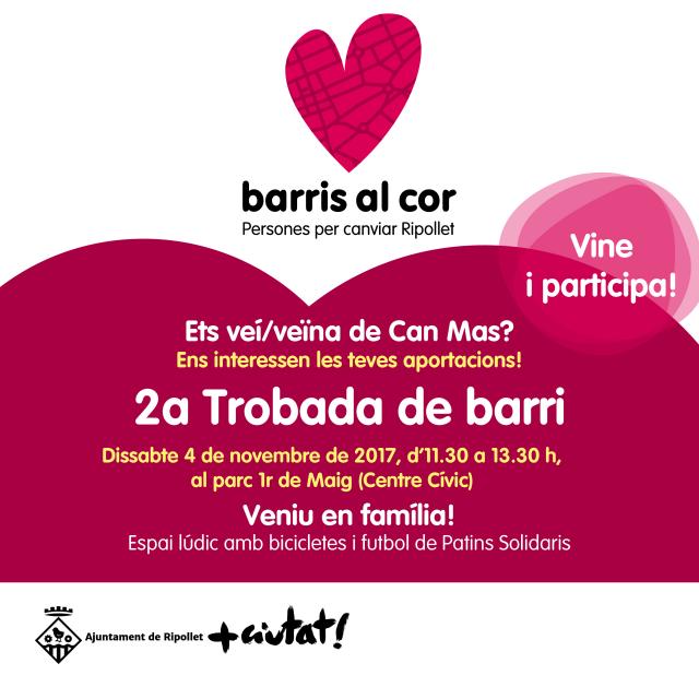 Aquest dissabte, 4 de novembre, de les 11.30 a les 13.30 h, el parc del Primer de Maig acollirà la segona trobada de barri a Can Mas, dins el programa "Barris al cor". Aquesta segona jornada per objectiu fer la tornada de les aportacions i suggeriments que els veïns i veïnes del barri van fer durant la primera trobada celebrada el mes de juny. En aquella ocasió, una trentena de persones van participar en la posada en comú de la seva visió del barri: el que els agrada, el que canviarien i com ho farien per millorar-lo.