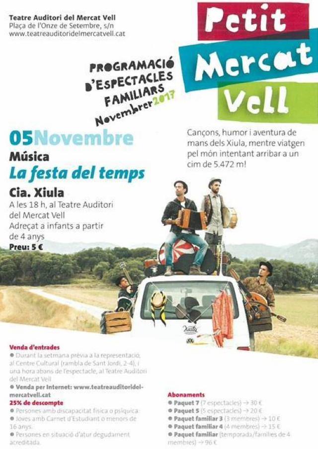 El Teatre Auditori del Mercat Vell acull diumenge 5 de novembre, a les 18 h, "La festa del temps", de la companyia de teatre infantil Xiula. Aquest espectacle forma part de la programació del "Petit Mercat Vell", una iniciativa promoguda pel Patronat de Cultura que, des de l'any passat, assegura una programació estable d'espectacles infantils d'èxit a Ripollet.
