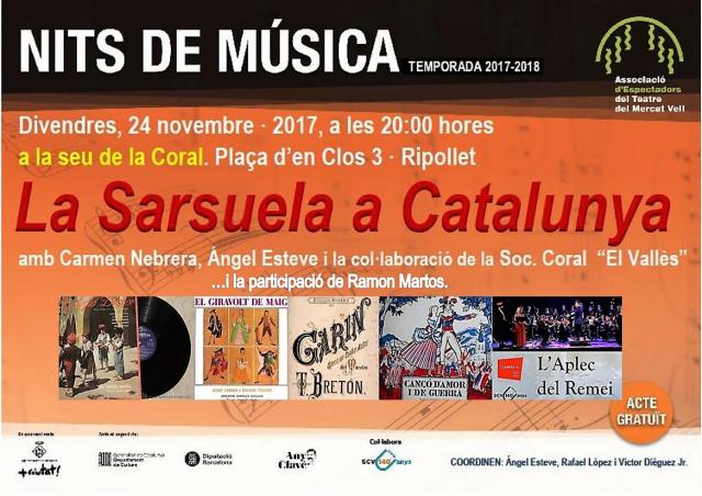 Carmen Nebrera, nova presidenta de la Societat Coral El Vallès, i Ángel Esteve, gran coneixedor de música culta i sarsuela, seran els responsables de guiar el públic en un viatge pel teatre líric i la sarsuela catalans, amb la participació de l'historiador local Ramon Martos. Durant la xerrada, es farà un repàs per alguns dels títols més emblemàtics del gènere, com ara "L'Aplec del Remei", de Josep Anselm Clavé, la primera sarsuela que es conserva en llengua catalana; "El giravols de maig", l'única òpera que va compondre Eduard Toldrà amb llibret de Josep Carner; o "Cançó d'amor i de guerra", sarsuela que combina elements wagnerians amb el folklore català. Segons els organitzadors, "coneixent el nostre teatre líric, la sarsuela, coneixeríem una mica més la nostra història".