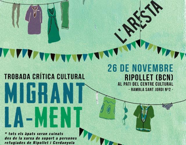 El col·lectiu popular l'Aresta ha preparat aquest diumenge una trobada crítica cultural sota el títol "Migrant la-ment", al pati del centre Cultural. L'objectiu de la trobada és platejar una reflexió crítica sobre migracions i les polítiques que l'envolten. Des de l'organització, s'entén aquesta trobada com "dues parts que es miren, es coneixen i veuen ombres que cada una d'elles projecten. Trobada com a idea que cap de les dues parts vol estar a sobre de l'altre, no es volen colonitzar, ni amb el cos ni amb la ment".