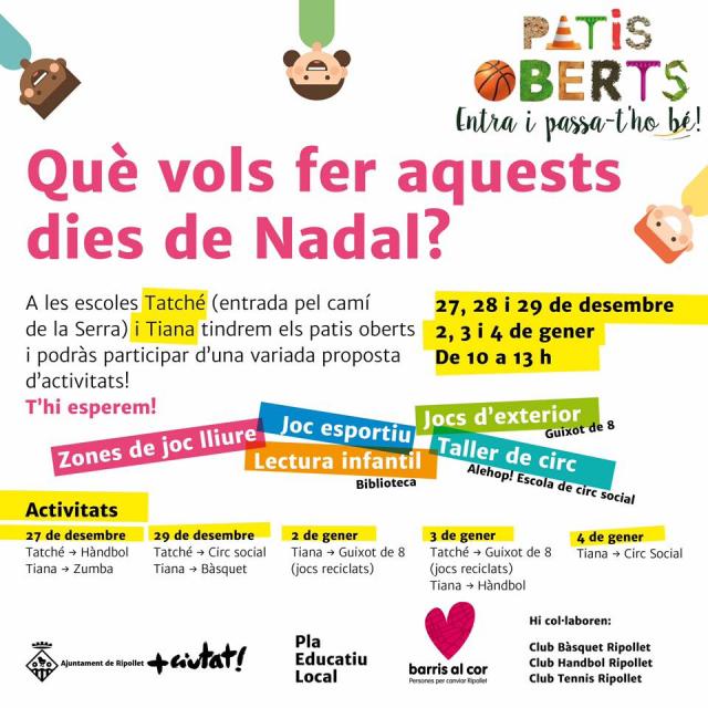 El dia 2 de gener, la companyia Guixot de 8, especialitzada en portar jocs a carrers i places d'arreu, instal·larà els seus originals jocs al pati de l'escola Tiana i el 3 de gener ho farà al de l'escola Enric Tatché. El 3 de gener, el pati de l'escola Tiana acollirà una sessió d'handbol i el dia 4 gaudirà del circ social, a càrrec d'Alehop! Escola de circ social, un projecte que es va posar en marxa el passat 14 de novembre a Ripollet per treballar la cohesió social amb joves de diferents instituts.