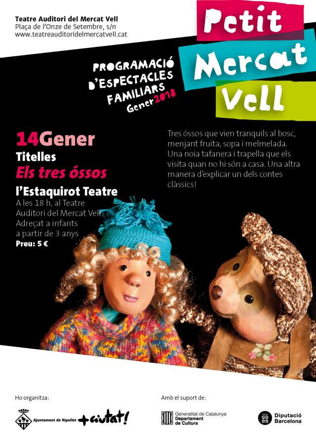 La companyia L'Estaquirot Teatre aterra al Teatre Auditori de Ripollet, aquest diumenge, amb el seu muntatge de titelles "Els tres óssos". Ho farà dins la programació d'espectacles familiars Petit Mercat Vell, a les 18 h.