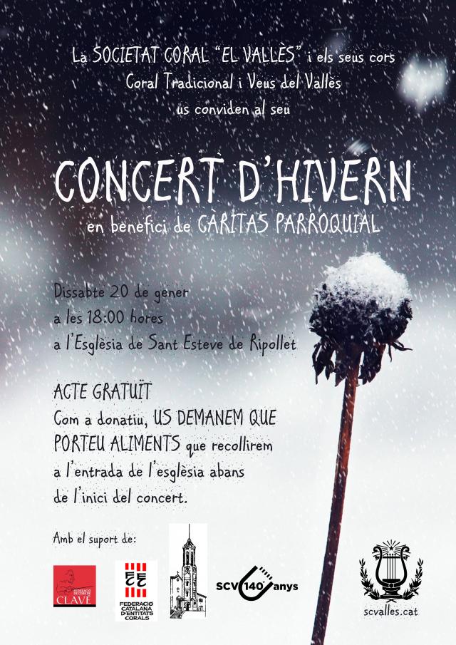 Els actes solidaris a Ripollet no acaben amb les festes de Nadal. La Societat Coral "El Vallès" i els seus cors, Coral Tradicional i Veus del Vallès, conviden la ciutadania al seu Concert d'Hivern el dissabte 20 de gener a les 18.00 h. El concert, en benefici de Càritas Parroquial, tindrà lloc a l'Església de Sant Esteve de Ripollet.