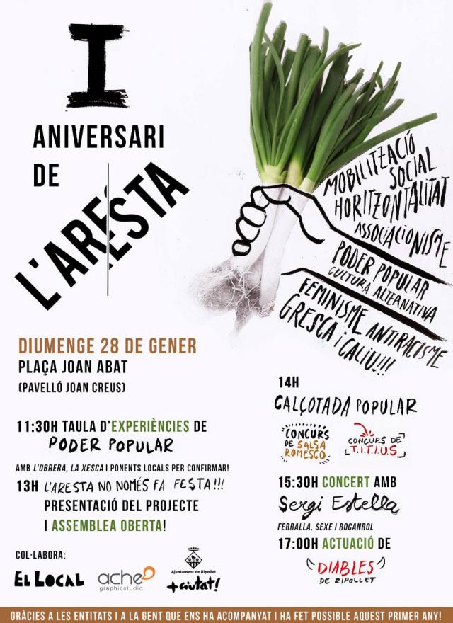 Aquest diumenge 28 de gener, la plaça Joan Abad acull el primer aniversari del col·lectiu popular L'Aresta. L'entitat es presentava fa justament un any, al pati del Centre Cultural, com un col·lectiu juvenil que pretenia aglutinar les inquietuds de la joventut ripolletenca per donar-les forma i oferir una bona programació d'oci a Ripollet.