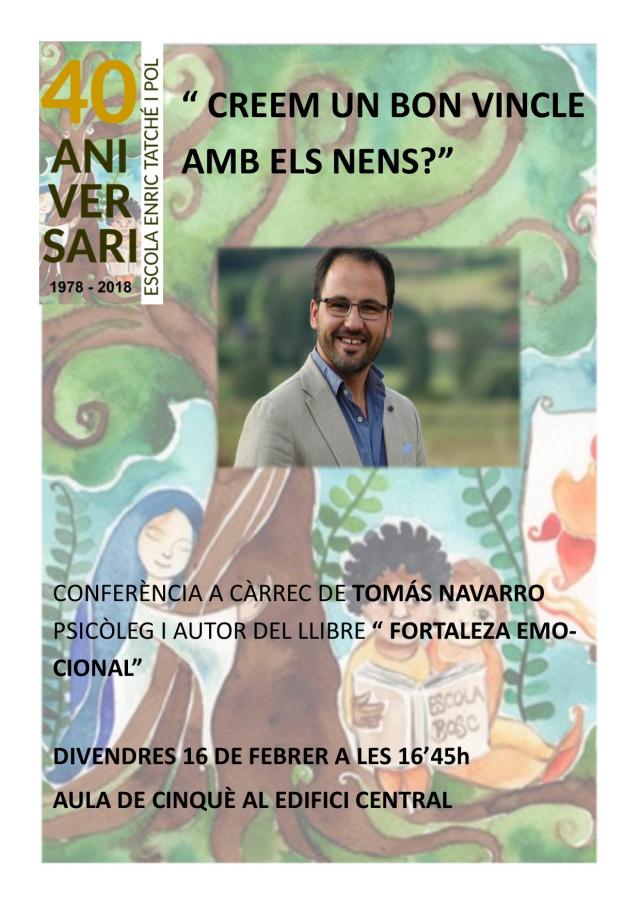 Una de les activitats principals d'aquest mes tindrà lloc divendres 16 de febrer, a l'aula de 5è de l'edifici central de l'Escola, a les 16.45 h. Es tracta de la conferència "Creem un bon vincle amb els nens", a càrrec de Tomás Navaroo, psicòleg i autor del llibre "La fortaleza emocional".