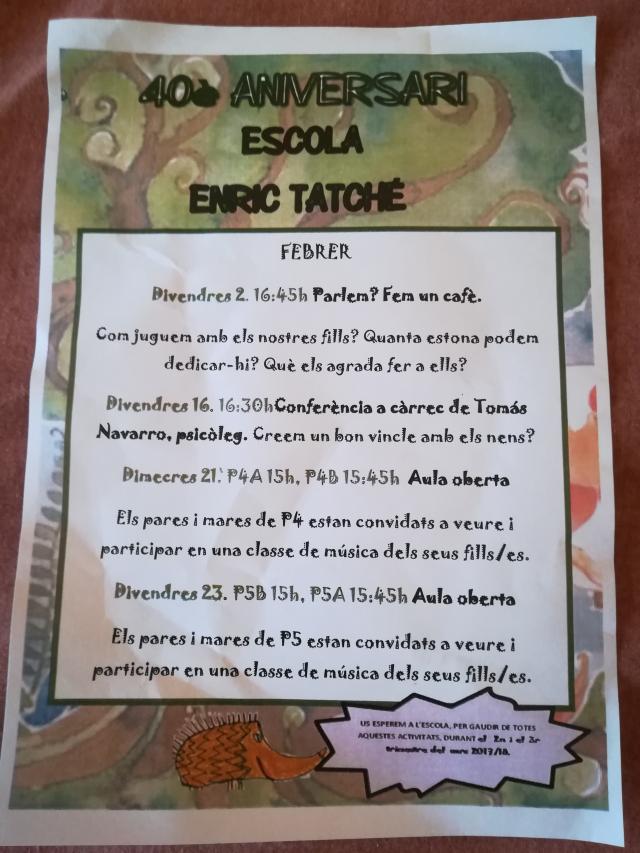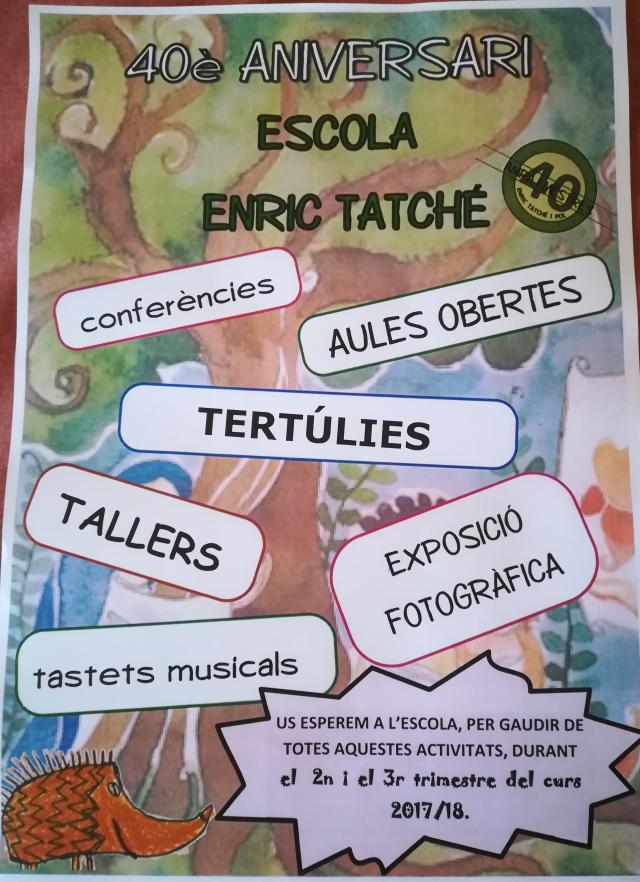 Aquest 2018, l'Escola Enric Tatché celebra el seu 40è aniversari. Famílies i mestres han creat una comissió específica que s'encarrega de dissenyar la programació que servirà per commemorar aquesta efemèride al llarg del segon i tercer trimestre del curs. Hi haurà conferències pedagògiques, on els ponents oferiran assessorament a les famílies sobre diferents temes relacionats amb els infants; tallers familiars de robòtica, cuina, artesania o esports; trobades de famílies i mestres; classes obertes de música, anglès i educació física; una exposició fotogràfica; tastets musicals; un lipdub familiar i un dinar de germanor; i un dia cooperatiu on es milloraran alguns espais del centre.
