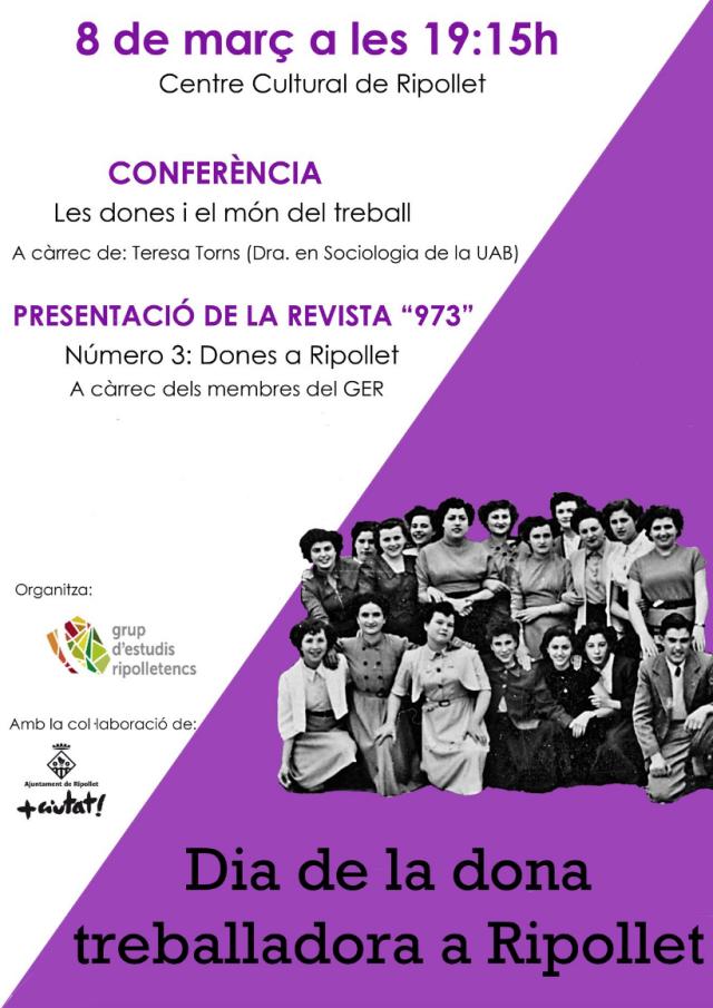 Aquest dijous, 8 de març, el Grup d'Estudis Ripolletencs (GER) organitza una jornada en el Dia Internacional de les Dones. Es farà una conferència que tractarà el tema de la dona i el treball i es presentaran els articles del número 3 de la revista '973', dedicat a les dones de Ripollet. L'acte tindrà lloc al Centre Cultural a les 19 h.