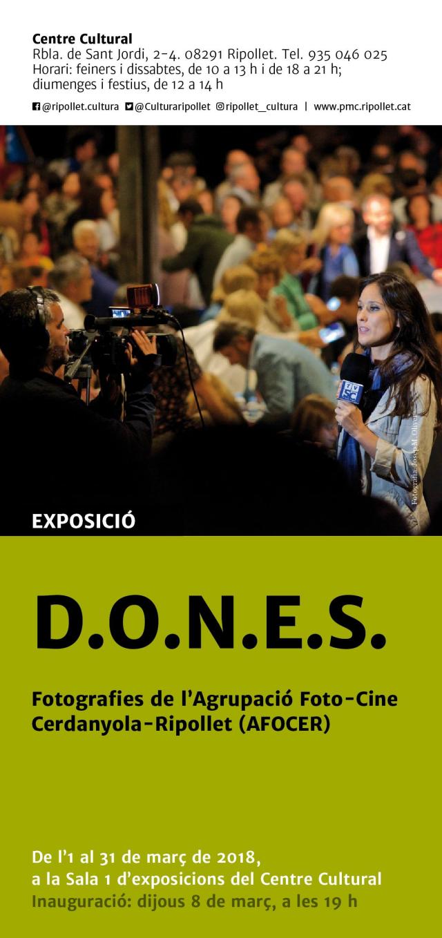 AFOCER inaugurarà, a les 19 h, la mostra fotogràfica "D.O.N.E.S. Fotografies de l'Agrupació Foto-Cine Cerdanyola-Ripollet (AFOCER)", la qual pretén abordar l'evolució del paper de la dona, des d'una societat més tradicional fins al moment actual. Les imatges, obres dels socis de l'entitat, volen reflexionar sobre estereotips, rols socials i el sostre de vidre, concepte que s'utilitza per fer referència a la barrera que dificulta l'accés de les dones a nivells de responsabilitat.