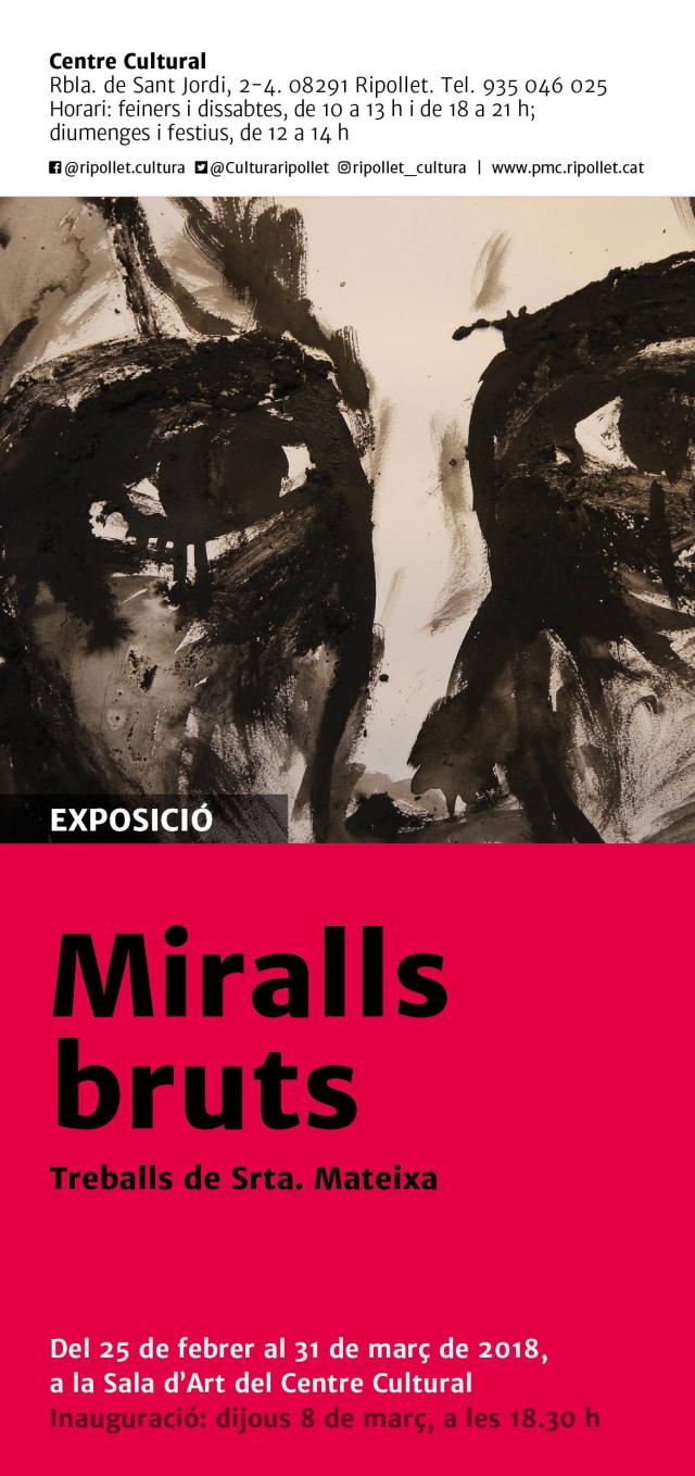 A les 18.30 h, tindrà lloc, a la Sala d'Art, la inauguració de la mostra de pintura de la jove artista montcadenca Srta. Mateixa. La seva obra, de traços enèrgics i viscerals, se centra en l'exploració de l'angoixa a través dels seus autoretrats, sota el títol "Miralls bruts"