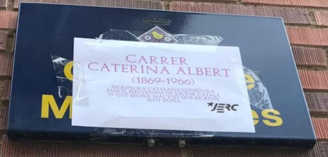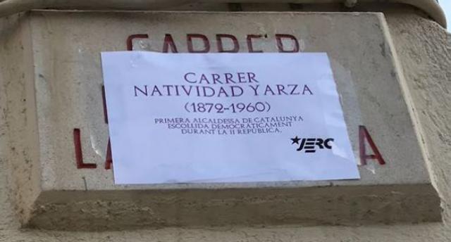 El passat 8 de març, membres de les JERC van sortir al carrer "per cobrir simbòlicament les plaques dels carrers dedicats a sants o a personatges històrics que han comès genocidis, com poden ser Isabel la Catòlica o Pizarro, per altres noms de dones molt importants pel que van fer i que en general van lluitar pels seus drets". Els cartells que es van penjar portaven els noms de "Lluita feminista", "8 de març", Caterina Albert, Montserrat Roig, Frida Kahlo, Clara Campoamor, Muriel Casals, Maria Aurèlia Capmany i Farnés, Rosa Luxemburg, Rosa Parks, Natividad Yarza, Malala Yousafzai, Margarida Borràs, Rosalind Elsie Franklin i Silvia Federici.