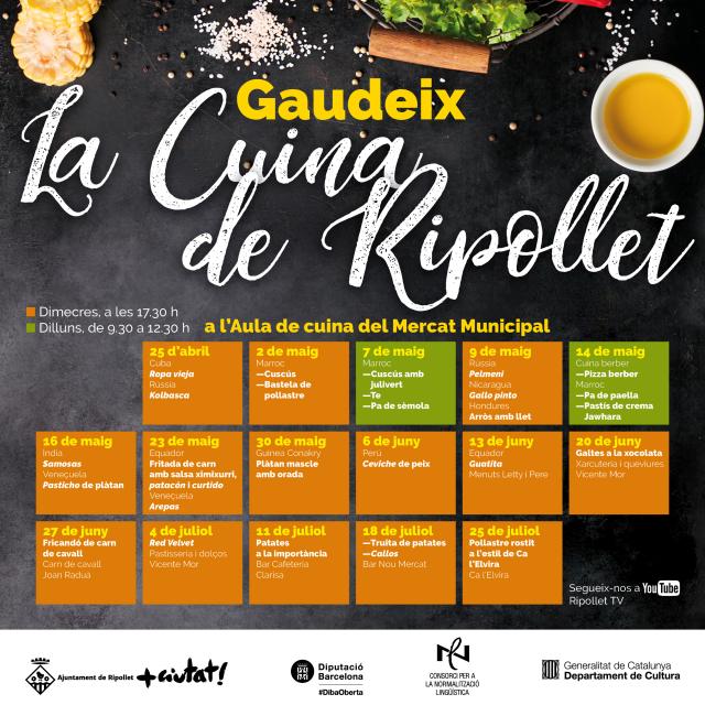 "La cuina de Ripollet" és un projecte endegat per la regidoria de Comerç de l'Ajuntament, amb el suport del Consorci de Normalització Lingüística. Es durà a terme a L'aula de cuina del Mercat, que acollirà setze jornades de cuina, amb la voluntat de dinamitzar el Mercat i visualitzar, de la mà de parades, restauradors i persones voluntàries, la diversitat gastronòmica de la ciutat, des d'una vessant intercultural.