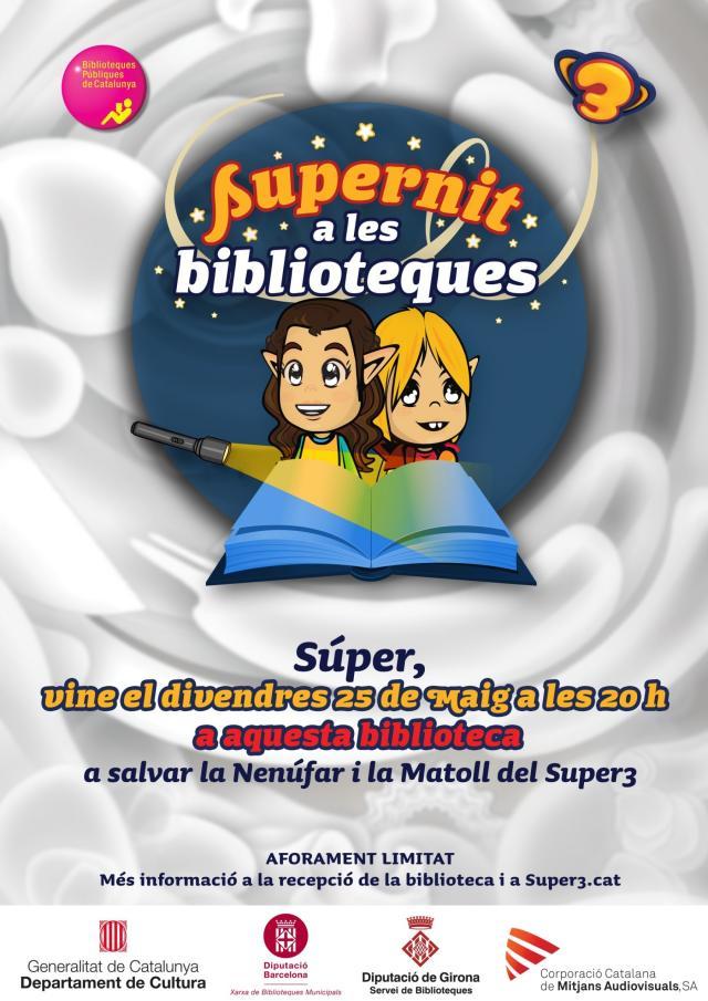 Aquest divendres, 25 de maig, entre les 20 i les 21 h, més de 150 poblacions i 270 biblioteques municipals de tot Catalunya oferiran conjuntament la "Supernit", una activitat multitudinària de foment de la lectura, organitzada pel Super3 i pel Departament de Cultura de la Generalitat de Catalunya amb l'objectiu de promoure la lectura entre el públic infantil.