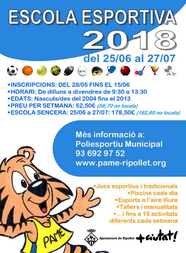 L'Escola Esportiva romandrà oberta del 26 de juny al 27 de juliol del 2018, de 9.30 a 13.30 h. El preu per gaudir de les cinc setmanes d'Escola Esportiva és de 178,50 € pels infants empadronats a Ripollet (192,60 € pels no locals), mentre que el preu per una sola setmana són 52,50 € (56,70 € no locals). Les famílies que inscriguin germans/es en el mateix període, rebran una bonificació del 20%. Enguany s'ofereixen 300 places.