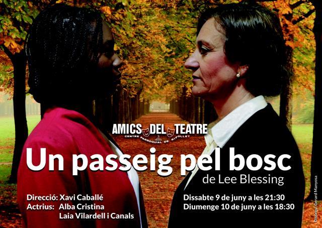Aquest dissabte, 9 de juny, Amics del Teatre estrena el muntatge teatral "Un passeig pel bosc", de Lee Blessing. Xavi Caballé dirigeix l'obra i Alba Cristina i Laia Vilardell i Canals són les dues actrius que pujaran sobre l'escenari del Centre Parroquial, un cop enllestides les obres en l'estructura de l'edifici que afectaven el teatre. L'entitat oferirà dues funcions: dissabte 9 de juny, a les 21.30 h, i diumenge 10 de juny, a les 18.30 h. Les entrades, que tenen un preu de 10 €, es poden adquirir al web d'Amics del Teatre.