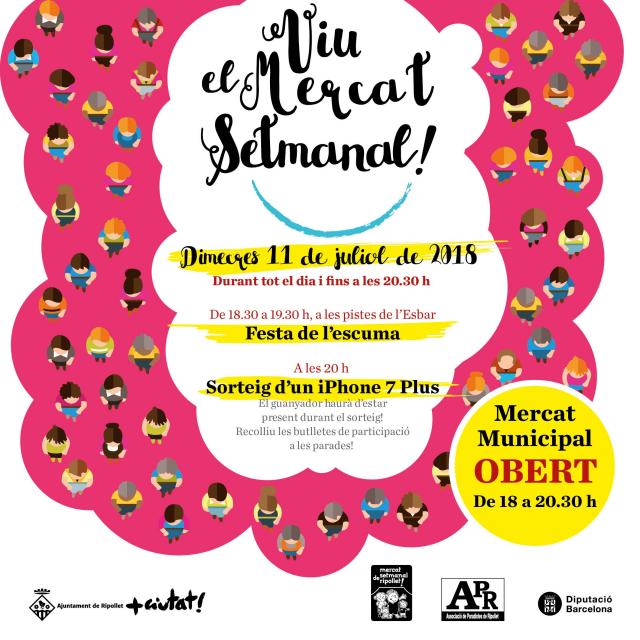 L'Associació de Paradistes de Ripollet organitza, aquest dimecres, 11 de juliol, amb la col·laboració de l'Ajuntament de Ripollet i la Diputació de Barcelona, una nova edició del "Viu el mercat setmanal!". Les parades estaran obertes fins al vespre i durant la jornada es podrà gaudir d'una programació d'activitats.