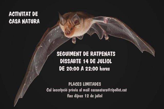 El pròxim dissabte, 14 de juliol, l'Escola de l'Aigua i Casa Natura oferiran una activitat per conèixer millor els ratpenats, que tindrà lloc de 20 h a 22 h aproximadament. L'activitat és gratuïta i requereix inscripció prèvia, ja que les places són limitades. Els interessats es poden inscriure fins al dijous 12 de juliol, enviant un correu electrònic a casanatura@ripollet.cat.