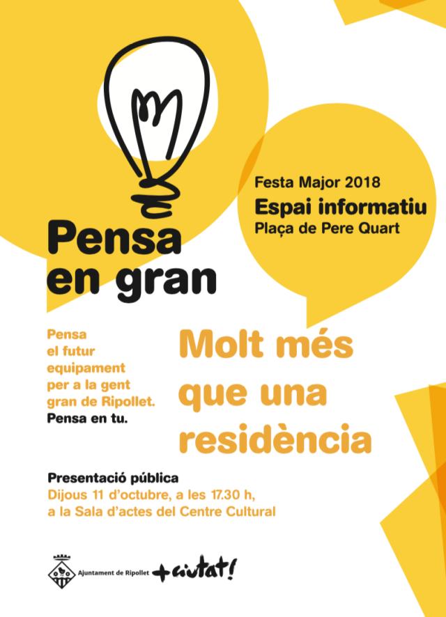 El projecte participatiu 'Pensa en gran', que es va dur a terme de maig a juliol passat, conclou que Ripollet necessita un nou equipament per a la gent gran d'almenys 132 places de residència públiques concertades (ràtio de 2,32 places per cada 100 habitants), així com una ampliació de l'oferta del Centre de Dia, que actualment compta amb 38 places concertades i una llista d'espera de 50 persones.