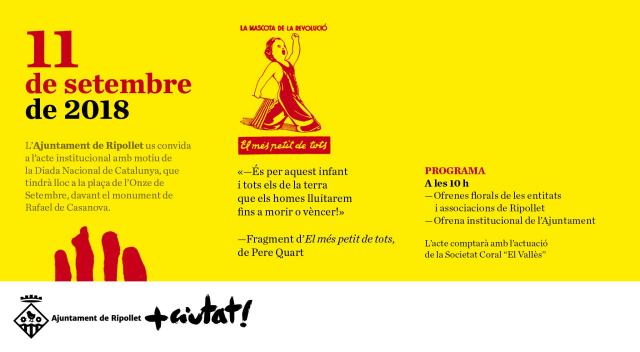 L'acte institucional amb motiu de la Diada Nacional de Catalunya es durà a terme aquest dimarts, a les 10h, a la plaça Onze de Setembre, davant del monument a Rafael de Casanova. L'ofrena institucional de l'Ajuntament anirà precedida pels oferiments florals de prop d'una vintena d'entitats.