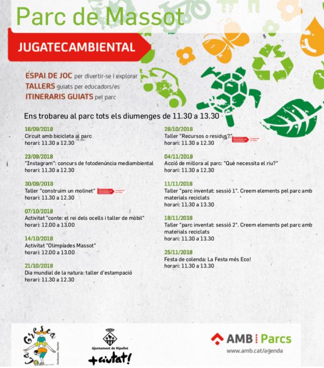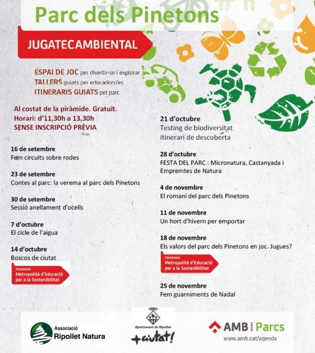 Aquest 16 de setembre, coincidint amb l'inici del curs escolar, la Jugatecamebiental comença una nova temporada. Fins a finals de novembre, aquesta activitat mediambiental torna als parcs dels Pinetons i de Massot per convertir-los en espais lúdics gratuïts amb tallers, jocs i itineraris guiats. Les Jugatequesambientals, iniciativa promoguda per l'Àrea Metropolitana de Barcelona amb la col·laboració de l'Ajuntament de Ripollet, tindran lloc tots els diumenges, d'11.30 a 13.30 h.