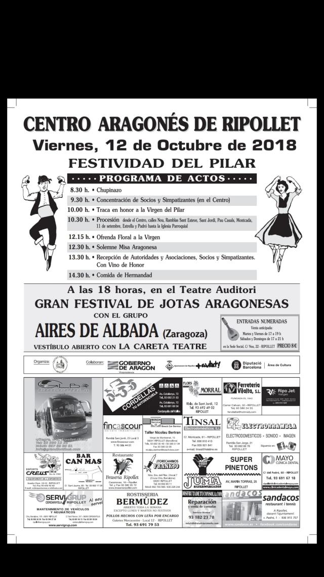 Després de tres setmanes de celebracions, el Centro Aragonés de Ripollet posa punt final a la seva gran festa aquest divendres 12 d'octubre. Dissabte 22 de setembre, inaugurava les Festes el pregó, enguany, a càrrec de Mar Vaquero, alcaldessa de María de Huerva i diputada de les Corts d'Aragó i, des de llavors, tots els caps de setmana han estat plens d'activitats, com ara esmorzars, concursos i campionats.