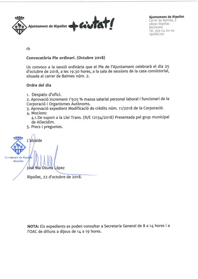 Avanç del Ple Ordinari del 25 d'octubre del 2018
