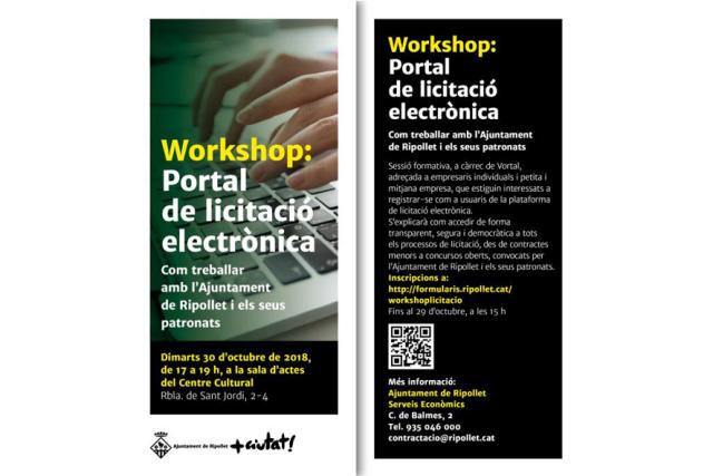 Per tal de facilitar aquesta transició, l'Ajuntament de Ripollet ha convocat dues sessions de formació sobre aquest portal, que tindran lloc el pròxim dimarts, 30 d'octubre. Així, al matí, l'empresa VORTAL, adjudicatària del servei, realitzarà una sessió de formació al personal municipal que actuarà com a operador de la plataforma. I a la tarda, s'oferirà una altra, en aquest cap dirigida a autònoms i a personal de petites i mitjanes empreses, interessats a donar-se d'alta al nou portal. Aquest segon Workshop tindrà lloc de 17 a 19 h, a la sala d'actes del Centre Cultural. Les inscripcions s'han de realitzar online, emplenant el següent formulari.