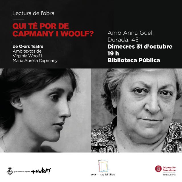 Avui dimecres, 31 d'octubre, a les 19 h,la Biblioteca acollirŕ l'espectacle "Qui te por de Capmany i Woolf?", un monňleg dirigit per Tilda Espluga i interpretat per l'actriu Anna Güell, que aplega dos textos: una conferčncia que Virginia Woolf va pronunciar en una Societat de dones el 1931 i una carta que Maria Aurčlia Capmany va publicar l'any 1971. Aquests textos, vestits d'intel·ligčncia, ironia i diversió, serveixen per a reflexionar al voltant del paper de les dones en l'escriptura i de la seva lluita per la igualtat social i econňmica.