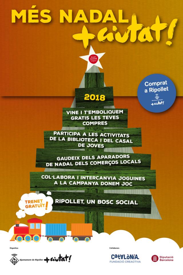 El divendres, 30 de novembre, es va presentar la campanya de ciutat que l'Ajuntament de Ripollet ha preparat per a aquest Nadal 2018 i que porta per nom Més Nadal + Ciutat!. L'alcalde de Ripollet, Jose M. Osuna, va estar acompanyat per la regidora de Comerç, Pilar Castillejo, i pel director general del grup Catalònia Fundació Creactiva, el doctor Joaquim Serrahima. La campanya ha volgut recollir en un sol programa totes les activitats organitzades pels diferents departaments municipals amb motiu del Nadal. Es tracta d'una iniciativa on "la promoció del comerç local té un pes important, però és una campanya que pretén anar més enllà, seguint la línia del que s'havia anat fent fins ara, amb un clar vessant social i amb uns valors de solidaritat i responsabilitat social", va explicar l'alcalde.