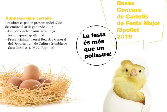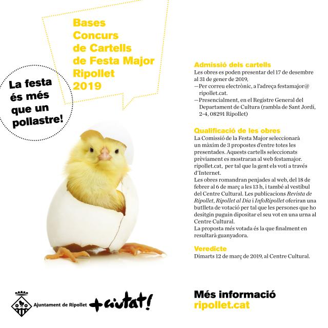 L'Ajuntament de Ripollet ha obert el termini de presentació de les obres del Concurs de cartells per la Festa Major 2019. Com cada any, aquest certamen té la finalitat d'escollir la imatge de les festes que tindran lloc el 23, 24, 25 i 26 d'agost de 2019. Enguany, la Comissió de la Festa Major ha treballat amb la idea que "la Festa és més que un pollastre", fent referència al fet que gran part dels cartells que es presenten cada any tenen el pollastre com a element central.