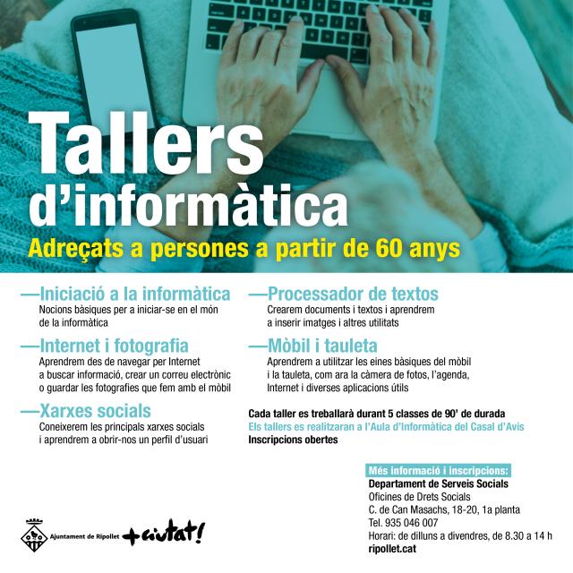 Als tallers d'informàtica, a banda d'aprendre les nocions bàsiques per a iniciar-se en el món de la informàtica, també es treballen temes com internet i fotografia, xarxes socials, processador de textos i mòbil i tauleta. Es tracta d'afavorir l'accés de les persones grans a les noves tecnologies. El taller de memòria, per la seva banda, és fonamentalment preventiu, amb exercicis on es treballen l'atenció, la concentració i la lògica.Per a més informació i inscripcions, cal adreçar-se a les Oficines de Drets Socials, al c. de Can Masachs, 18-20, 1a planta o al telèfon 93 504 60 07. L'horari d'atenció és de dilluns a divendres, de 8.30 a 14 h.
