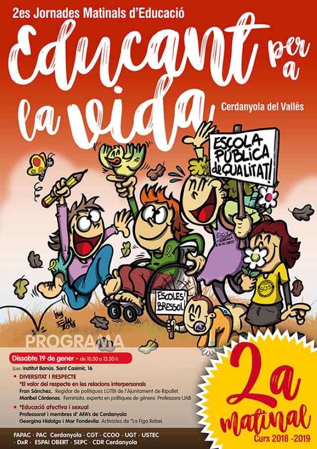 Aquest dissabte, 19 de gener, es celebraran les segones jornades sobre valors Educant per a la vida, de 10.30 a 13.30 h, a l'Institut Banús de Cerdanyola del Vallès. Aquests acte tracta sobre "els valors que es necessiten com a societat per poder conviure en pau i llibertat" i en particular del tracte en les relacions interpersonals, amb el títol "El valor del respecte".