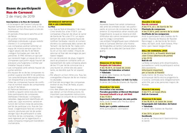 Els interessats en participar tenen fins al 15 de febrer per sol·licitar equip de so i fins al 22 de febrer per formalitzar la inscripció. Les bases del Carnaval estan al Centre Cultural i a ripollet.cat
