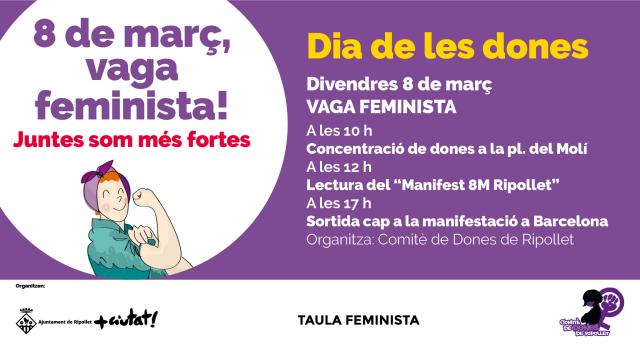 Els actes del Comitè de Dones de Ripollet són els que tenen un caire més reivindicatiu, al voltant de la vaga feminista convocada pel 8 de març. Així, el diumenge, 3 de març, celebrarà un "vermut lila", en suport a aquesta acció. El Comitè també proposa sumar-se a la manifestació de dijous, 7 de març, a Terrassa i a la de Barcelona, del dia 8. A Ripollet, el mateix dia 8, ha convocat a les 10 h una concentració de dones a la plaça del Molí i a les 12 h, la lectura del manifest 8M Ripollet. El text fa una crida a la vaga de cures en la família i la societat, així com a la vaga de consum, laboral i educativa.