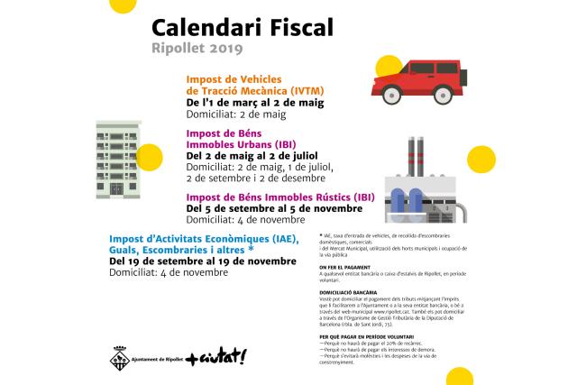 El passat 1 de març va començar el termini per al primer dels pagaments del Calendari fiscal de Ripollet 2019, corresponent a l'Impost de Vehicles de Tracció Mecànica (IVTM), que s'allargarà fins al 2 de maig. Entre maig i juliol s'haurà de fer el pagament de l'Impost de Béns Immobles Urbans (IBI) i el darrer trimestre de l'any serà el torn de l'Impost de Béns Immobles Rústics i de l'Impost d'Activitats Econòmiques (IAE), Guals i Escombraries.