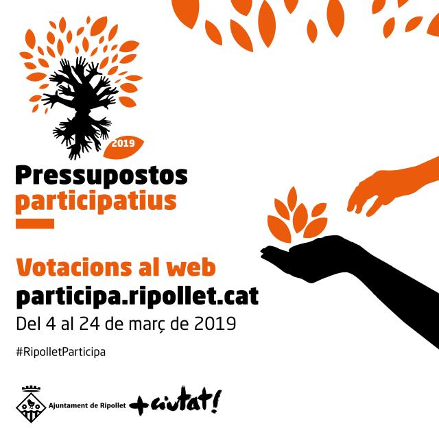 Fins al pròxim diumenge, 24 de març, es poden votar els projectes finalistes a la 3a edició dels Pressupostos Participatius 2019, convocats per l'Ajuntament de Ripollet i dotats amb un total de 300.000 euros. A través del web participa.ripollet.cat es pot accedir a la votació, escollint quatre dels projectes. Més de 300 alumnes dels instituts públics i concertats de Ripollet van presentar, el passat 26 de març al Teatre Auditori del Mercat Vell, les seves propostes, en el marc de #RipolletParticipa.