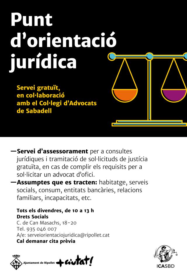 Per tal d'utilitzar el servei d'orientació jurídica, cal demanar cita prèvia a Drets Socials, c. de Can Masachs, 18-20, al telèfon 935 046 007 o al correu electrònic serveiorientaciojuridica@ripollet.cat.