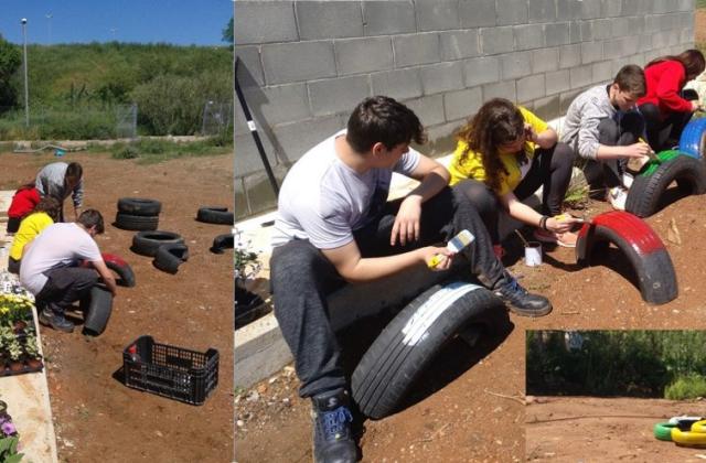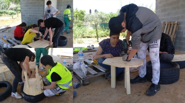 A les imatges podeu veure alguns exemples de treball col·laboratiu, com un taller de realització de jardineres amb pneumàtics reciclats i un altre amb palets reciclats i un taller de realització d'un parterre també amb pneumàtics.