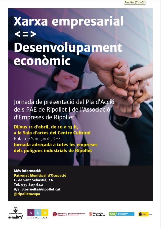 El dijous, 11 d'abril, el Centre Cultural acollirà la jornada 'Teixit empresarial i desenvolupament econòmic', adreçada a totes les empreses dels polígons industrials de Ripollet. L'objectiu de la trobada, que es desenvoluparà de 10 a 13 h, és promocionar l'associacionisme empresarial, a través de l'Associació d'Empreses de Ripollet i la presentació d'altres casos d'èxit al Vallès. Durant la jornada, que comptarà amb la intervenció de representants de l'Agència de Desenvolupament Econòmic de l'AMB i del Servei de Teixit Productiu de la DIBA, el Patronat Municipal d'Ocupació presentarà als empresaris el Pla d'acció dels polígons d'activitat econòmica (PAE) de Ripollet.