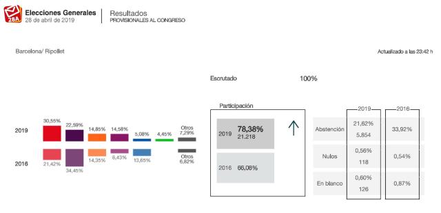 El PSC guanya les Eleccions Generals 2019 a Ripollet